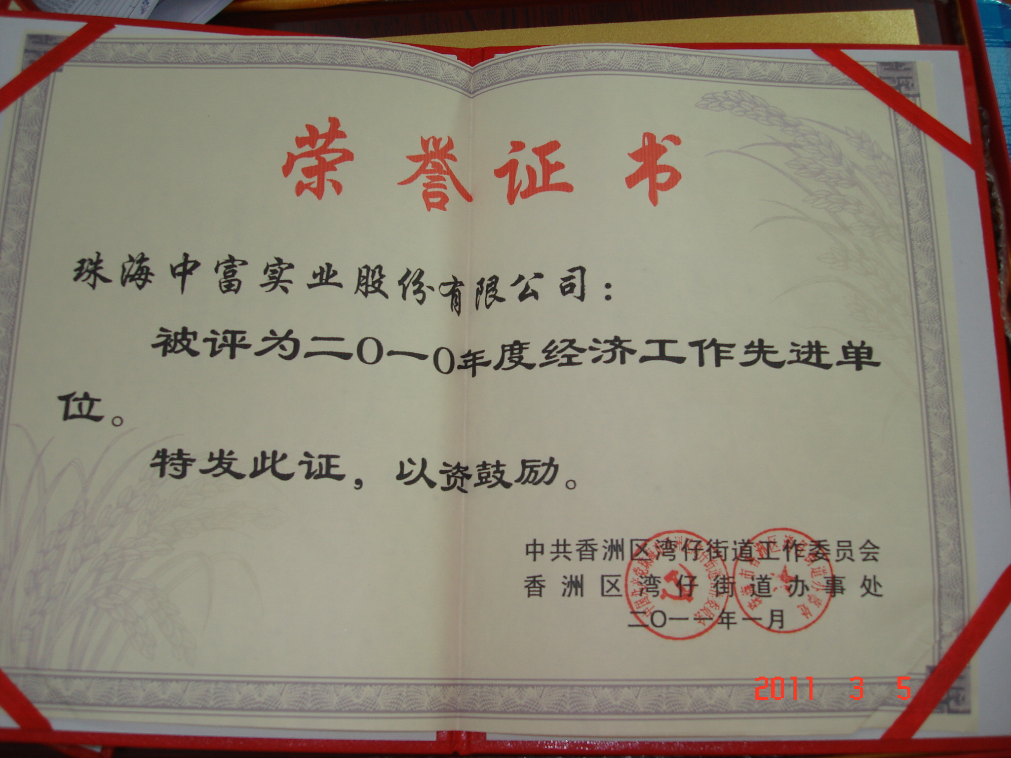 2011年剛邁入新的起點(diǎn),珠海中富喜訊不斷傳來(lái),先后被評(píng)為“2010年度經(jīng)濟(jì)工作先進(jìn)單位”和“2010年度安全生產(chǎn)工作先進(jìn)單位”。支持中心人事部的曾思明和張華芬同志也分別榮獲“珠海保稅區(qū)2010年度安全生產(chǎn)工作先進(jìn)個(gè)人”和“珠海保稅區(qū)2010年度勞動(dòng)保障監(jiān)察工作先進(jìn)個(gè)人”。